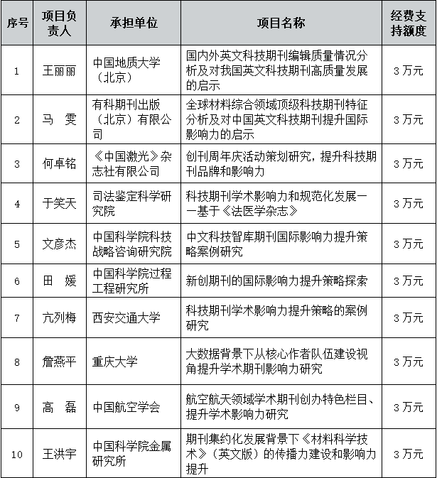 按照《中国科技期刊卓越行动计划实施细则》、《中国科协财政项目管理办法》规定,现对2021年度中国科技期刊卓越行动计划选育高水平办刊人才子项目-青年人才支持项目拟入选项目信息进行公示(详见附件)。