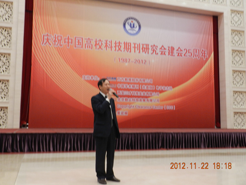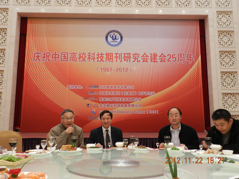 今年是中国高校科技期刊研究会(原来的中国高校自然科学学报研究会)建会25周年。今天晚上(2102年11月22日),在第16次年会期间举行了庆祝晚宴,五百多会员集聚一堂,热烈庆祝中国高校科技期刊研究会建会25周年。会上,理事长颜帅发言,研究会的老领导陈浩元、李兴昌、曹振中、龚汉忠等到会,与会代表还即兴载歌载舞,其乐融融。在新的形势下,相信在广大会员的努力下,中国高校科技期刊研究会一定会越办越好。