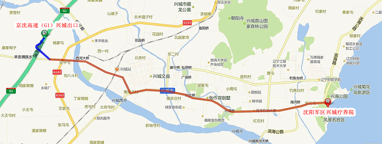 报到乘车路线:自驾车走京哈高速(原京沈高速)兴城出口,详见附图。沈阳军区兴城疗养院距离兴城火车站9公里,乘出租车15元/趟左右;距离葫芦岛北站(动车站)22公里,乘出租车45元/趟左右。兴城市没有机场,疗养院距离锦州机场80公里,秦皇岛机场180公里,沈阳机300公里。