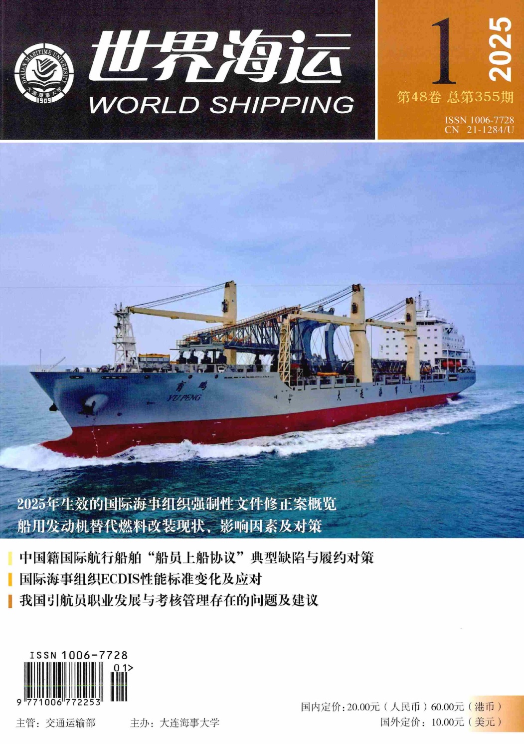 | 期刊简介: | 《世界海运》(World Shipping)杂志于1978年10月创刊,由交通运输部主管、大连海事大学主办,国际标准刊号ISSN 1006-7728,国内统一刊号CN 21-1284/U,面向国内外公开发行。月刊,每期定价20.00元,全年定价240.00元。 办刊宗旨:以国际的视角聚焦中国航运业发展和航运企业实践中的热点、难点问题,对国际海运经济、管理、法律和技术领域的相关问题进行专业、深入和前瞻性的解读和分析,着力搭建港航企业、贸易商、制造商和主管机关之间的信息交流平台,积极推进国际交流与合作,为政府、航运企事业单位管理者和从业人员决策、管理和操作提供参考,推动和促进我国航运业健康、快速发展。 主要栏目:热点聚焦、船舶与人员安全、环境保护、航海技术、船舶机电技术、船舶设计与建造、海法评论、航运经济与管理、海事管理、海事公约与法规评论、航史天地、航海手记、海运百科。 | ![]() |